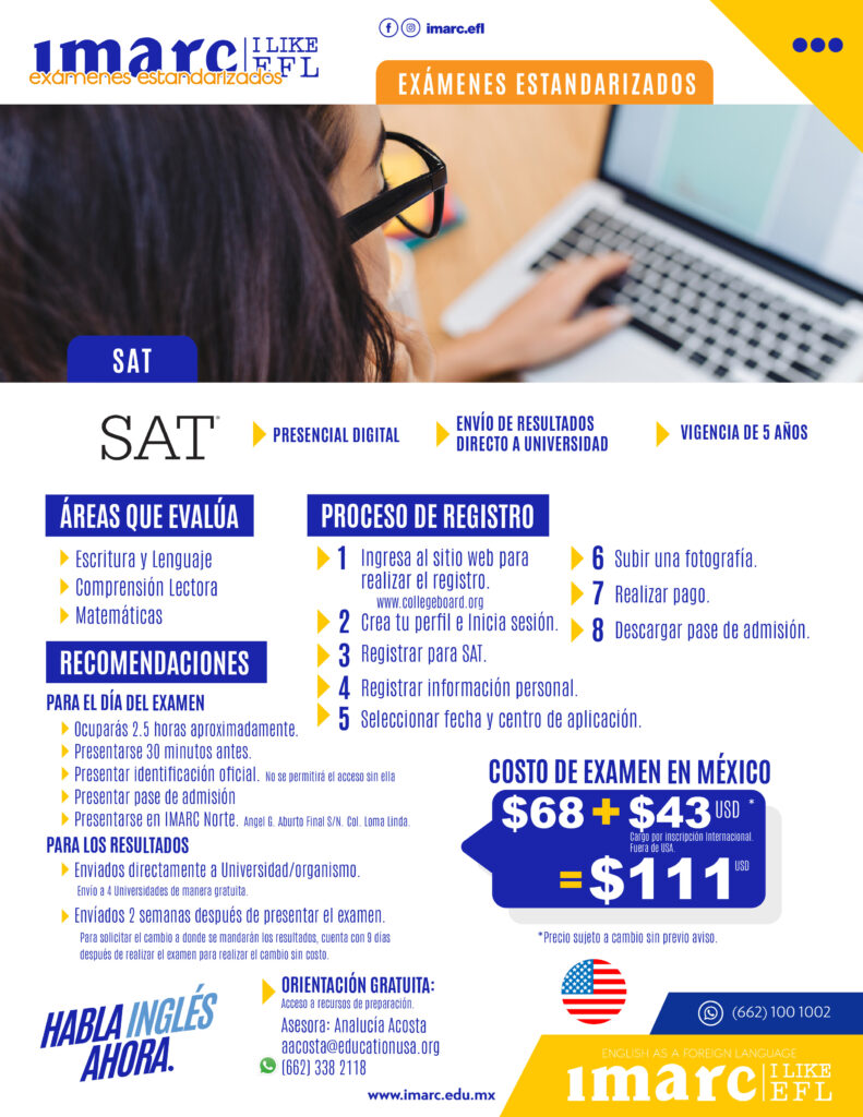El SAT Digital es una versión modernizada del examen estandarizado de admisión universitaria, diseñada para evaluar habilidades clave en lectura, escritura y matemáticas. Aunque se presenta de forma digital, el examen es presencial y debe realizarse en un centro autorizado, como nuestra institución. No es posible tomarlo en línea ni desde casa.